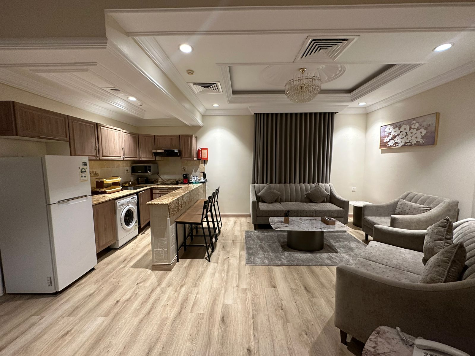 استمتع بإقامة مريحة في غرفة مجهزة بمطبخ كامل، غسالة، بياضات فاخرة، خزانة، حمّام متكامل، واي فاي مجاني، وموقف سيارات مجاني. كل ما تحتاجه لتشعر وكأنك في بيتك